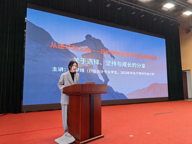 分享会上,薛梦晴结合自身经历,坦诚讲述了自己在高职阶段的迷茫彷徨,以及通过不懈努力成功通过专转本考试、稳步立足职场的奋斗历程。她从学历提升的备考技巧、专业技能的深耕方法、职场求职的经验心得、人际交往与心态调整等方面,分享了实打实的干货,叮嘱学弟学妹珍惜在校时光,夯实专业功底,摒弃浮躁心态,找准目标脚踏实地前行。