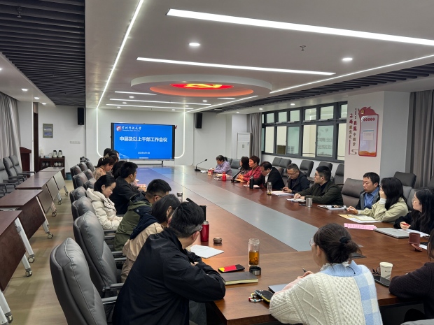 2026年4月14日,我校在5-316会议室召开中层及以上干部工作会议,全体校领导及中层干部参会,会议由党委副书记、校长朱丹平主持。